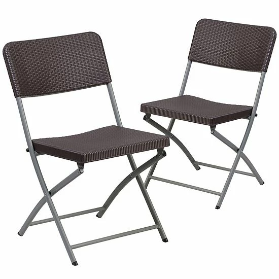 Add some pizzazz to your residential or commercial space with this stylish folding chair. This plastic chair has a woven rattan design throughout that offers an appealing look and is suitable for indoor or outdoor use. The durable steel tubular frame, double support braces and textured seat ensure safety while seated and make this an ideal event chair. Protective floor caps prevent your flooring from being marred when the chairs are moved. These chairs are portable and fold to transport and store.