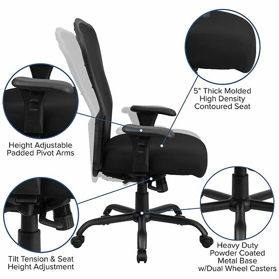This chair was designed to meet your around the clock needs. Also known as multi-shift task chairs, a 24-hour office chair is designed for extended use or multiple-shift environments. This chair can be used in a 9-5 setting, but it was specifically designed to meet the needs of workers in 911 dispatch offices, nurses’ stations, call centers, control room engineers, disc jockeys, and government personnel. The big and tall design also aids in accommodating larger and taller body types. This chair has been tested to hold a capacity of up to 400 lbs., offering a broader seat and back width. The high back extends to the upper back for greater lumbar support. Mesh office chairs can keep you more productive throughout your work day with its comfort and ventilated design. The synchro tilt control allows the chair’s back and seat to recline at different rates, increasing the angle between your torso and thighs. The contoured seat dissipates pressure points for greater comfort. The waterfall front seat edge removes pressure from the lower legs and improves circulation. Chair easily swivels 360 degrees to get the maximum use of your workspace without strain. The pneumatic adjustment lever will allow you to easily adjust the seat to your desired height. The adjustable armrests take the pressure off the shoulders and the neck, which minimizes the risk of pain. The heavy duty metal base is constructed to keep up with the demands of an intensive use chair.