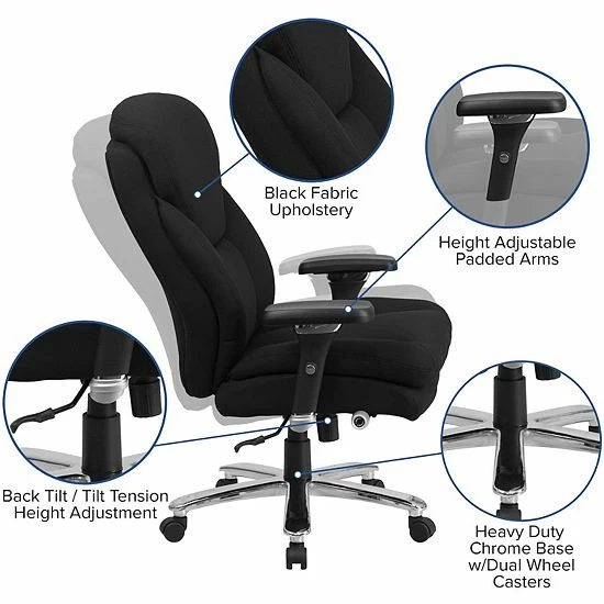 This Big & Tall Executive Office Chair is an ideal chair for larger and taller professionals who spend long hours sitting behind a desk. An extended upper back with integrated headrest and lumbar knob reinforces healthy posture. The 25 wide swivel seat is double padded with 4 of foam. Raise or lower the seat using the pneumatic height adjustment lever for a custom fit. Generously padded loop arms reduce pressure on the shoulders and neck providing additional comfort. Turn the tilt tension adjustment knob to increase or decrease the amount of force needed to rock or recline and lock the seat in place with the tilt lock mechanism. This sturdy chair has a heavy duty chrome base, smooth rolling dual wheel casters and a 400 pound weight capacity. Whether you’re buying chairs for a 911 dispatch office, call center, or control room, this 24/7 intensive use office chair is the right chair for the job.