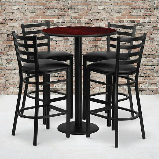 Don’t have time to search through hundreds or thousands of table and seating options? This complete Bar Height Table and Stool set saves you time to focus on your growing business. This set includes an elegant Mahogany Laminate Table Top, Round Base and 4 Metal Ladder Back Barstools. Surface is heat, scratch and moisture resistant. Easily clean using a mild detergent and water, dry clean to keep your tables spotless. Use this setup in sports bars, banquet halls, restaurants, break room/cafeteria settings or any other social gathering. Mix in bar height tables with standard height tables for a more varied seating selection. Whether you are just starting your business or upgrading your home or business furniture this restaurant quality bar table set will round out your dining space.