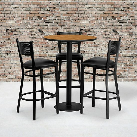 Don’t have time to search through hundreds or thousands of table and seating options? This complete Bar Height Table and Stool set saves you time to focus on your growing business. This set includes an elegant Natural Laminate Table Top, Round Base and 3 Metal Grid Back Barstools. Surface is heat, scratch and moisture resistant. Easily clean using a mild detergent and water, dry clean to keep your tables spotless. Use this setup in sports bars, banquet halls, restaurants, break room/cafeteria settings or any other social gathering. Mix in bar height tables with standard height tables for a more varied seating selection. Whether you are just starting your business or upgrading your home or business furniture this restaurant quality bar table set will round out your dining space.