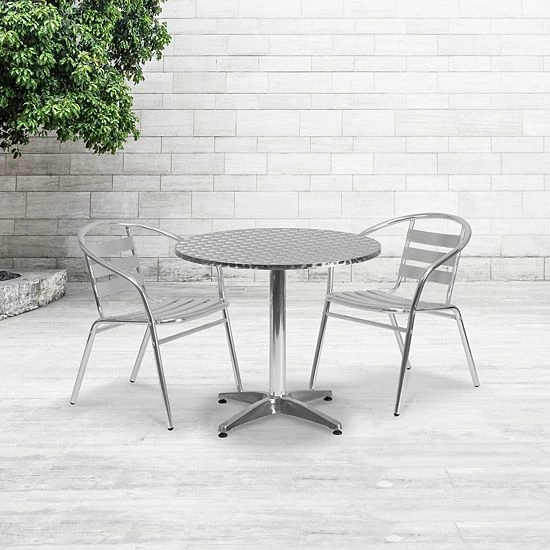 Whether you need to add more seating space or create an intimate conversation area, this versatile round table is up to the task. Enhance the look of your bistro, cafe, restaurant, hotel or home patio space without taking up too much real estate. The designer style stainless steel table top features a smooth surface for keeping items level. The column and base are constructed of lightweight aluminum material making it easy to move this table wherever you need it. Designed for all-weather use, this table is a great option for indoor and outdoor settings. For longevity, care should be taken to protect from long periods of wet weather. Whether you are just starting your business or upgrading your furniture this table is a wise investment.