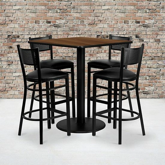 Don’t have time to search through hundreds or thousands of table and seating options? This complete Bar Height Table and Stool set saves you time to focus on your growing business. This set includes an elegant Walnut Laminate Table Top, Round Base and 4 Metal Grid Back Barstools. Surface is heat, scratch and moisture resistant. Easily clean using a mild detergent and water, dry clean to keep your tables spotless. Use this setup in sports bars, banquet halls, restaurants, break room/cafeteria settings or any other social gathering. Mix in bar height tables with standard height tables for a more varied seating selection. Whether you are just starting your business or upgrading your home or business furniture this restaurant quality bar table set will round out your dining space.