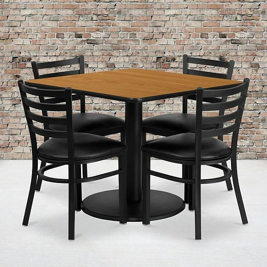 Don’t have time to search through hundreds or thousands of table and seating options? This complete Banquet Table and Chair set saves you time to focus on your growing business. This set includes an elegant Natural Laminate Table Top, Round Base and 4 Metal Ladder Back Chairs. Surface is heat, scratch and moisture resistant. Easily clean using a mild detergent and water, dry clean to keep your tables spotless. Use this setup in banquet halls, wedding ceremonies, hotel conferences, restaurants, break room/cafeteria settings or any other social gathering. The lightweight designer metal chair will enhance any environment. Whether you are just starting your business or upgrading your home or business furniture this restaurant quality table set will round out your dining space.