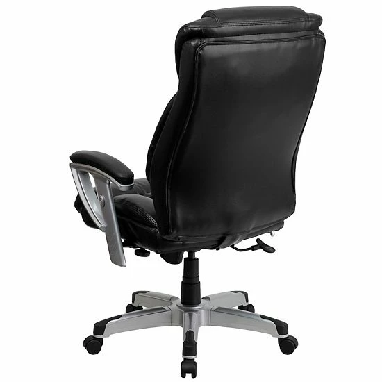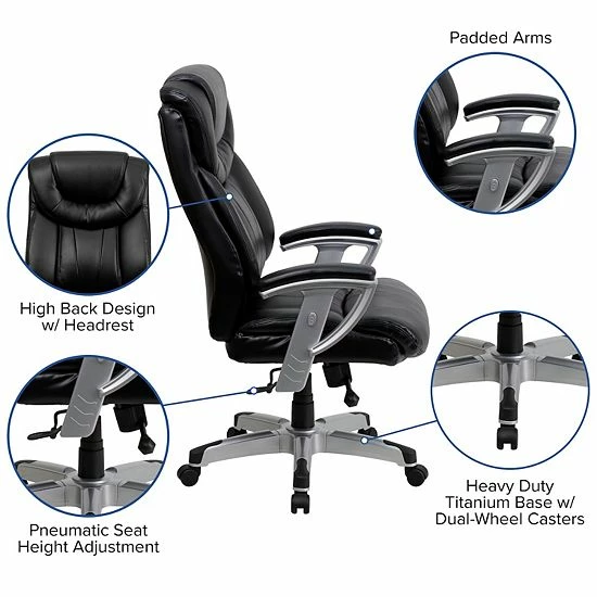 Finding a comfortable chair is essential when sitting for long periods at a time. Big & Tall office chairs are designed to accommodate larger and taller body types. This chair has been tested to hold a capacity of up to 400 lbs., offering a broader seat and back width. Upholstered in supple LeatherSoft upholstery, this chair will add an upscale look to your workspace. LeatherSoft is leather and polyurethane for softness and durability. The tilt lock mechanism rocks/tilts the chair and locks in an upright position while the tilt tension adjustment knob adjusts the chair’s backward tilt resistance. High back office chairs have backs extending to the upper back for greater support. The high back design relieves tension in the lower back, preventing long term strain. This office chair features plenty of thick, plush padding to provide greater support. Chair easily swivels 360 degrees to get the maximum use of your workspace. The pneumatic adjustment lever will allow you to easily adjust the seat to your desired height. The height and width adjustable padded armrests take the pressure off the shoulders and the neck. The silver nylon capped metal base with black caps prevents feet from slipping.