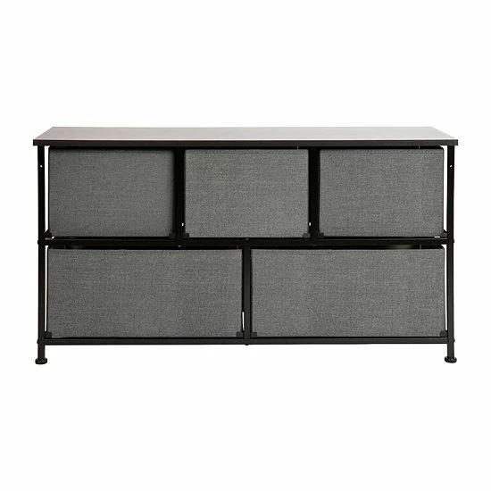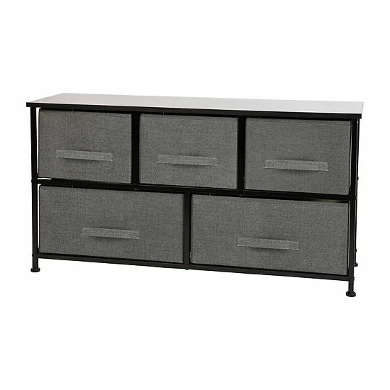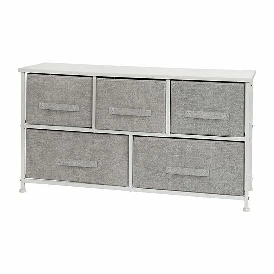 Get much needed storage at an economical price that works anywhere in your living space with this 5 drawer storage organizer. Whether you need a place for clothing, bath towels and washcloths, or bed linens, the five easy pull fabric drawers are a perfect solution. Use this wide storage unit as a nursery supply center, toy organizer or entryway table. Storage doesn’t have to be bulky to be strong. Metal screw construction securely joins the powder coated cast iron frame of this storage dresser together. The durable MDF wood top provides a hard surface to set books, lamps, or a vase of fresh flowers and holds up to 45 lbs. static weight capacity. Polypropylene fiber drawers not only look great but are fade and stain resistant to help this dresser with drawers retain its great looks. Quick and easy assembly can be achieved in 30 minutes or less with the step-by-step illustrated instructions or online PDF. Plastic adjustable floor glides protect your hard flooring surfaces and provide a stable platform on uneven flooring surfaces. Quickly remove spills with a clean damp cloth. Use this vertical dresser anywhere you need extra organization that goes above and beyond plain plastic bins.