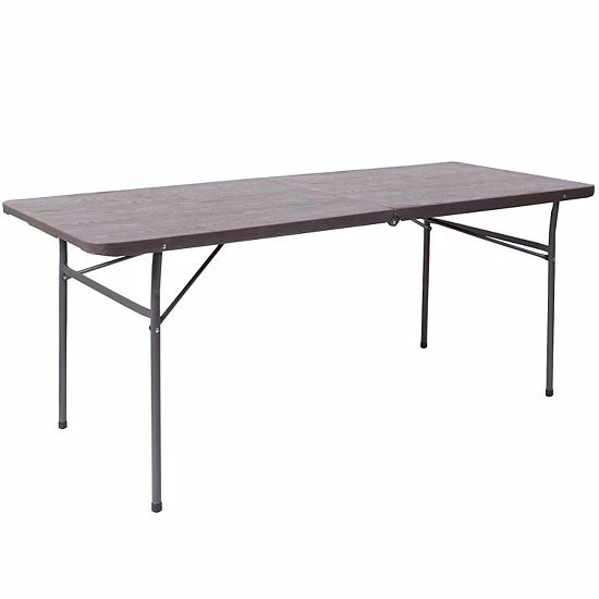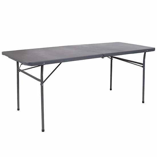 Take the stress out of hosting and say hello to the perfect solution for your seating crisis! This bi-fold plastic folding table is a great option when you need a temporary dining surface or an everyday workstation in your home or office. This versatile folding table can be dressed up or used as is with its dark colored top during holiday events, parties and arts and craft activities. Place multiple tables side by side or in rows to accommodate large party events. The waterproof, impact and stain resistant top have a 220 pound static load capacity and is commercial rated for use as a training table, in banquet halls and at trade shows. The thick, dark gray tabletop is 6′ long, 1.5 thick, and will seat up to 8 adults. Attractive gray powder coated legs lock securely in place while in use and non-marring floor caps protect your floor by sliding smoothly when you need to move the table. This durable, easy to clean table folds in half, making it easy to store and transport, using the convenient carrying handle attached on the side. The 30W x 72L Bi-Fold Dark Gray Plastic Folding Table with Carrying Handle is perfect for in-home events or on the deck or patio while entertaining during a barbeque. Designed for both indoor and outdoor use, store table indoors and protect the frame from extreme moisture. Rectangular folding tables offer the best solution for your home or business.