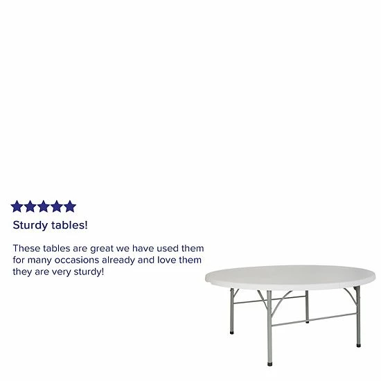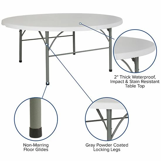 Say hello to the perfect solution for your seating crisis! The bi-fold round dining folding table is a great option for special event planners, catering companies and banquet facilities. This durable, easy to clean table is commercial rated for use in banquet halls, convention centers and at trade shows. Use during game night, dress it up for holiday parties, and coordinate crafts night. The granite white tabletop is 6′ in diameter, 2 thick, and will comfortably seat up to 8 adults. Its waterproof, impact and stain resistant top have a 771 pound static load capacity. Attractive gray powder coated legs lock securely in place while in use and non-marring floor caps protect your floor by sliding smoothly when you need to move the table. The table folds in half, making it easy to store and transport, using the convenient carrying handle attached on the side. When using for outdoor events store indoors to protect the frame from extreme moisture.