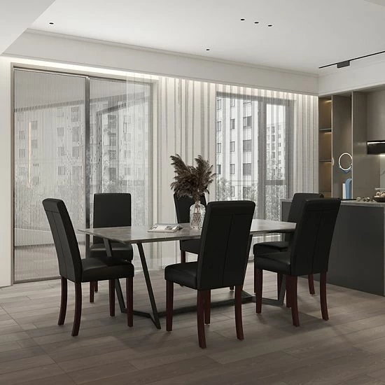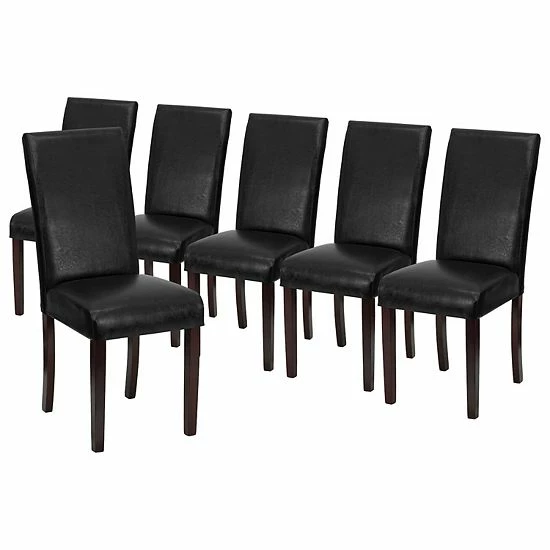 Bring elegance and style to your next brunch or dinner party with set of 6 contemporary parsons chairs. Featuring a traditional panel back design with sleek, black faux leather upholstery, this chair is the perfect blend of timeless style and modern detailing. The high density foam padding offers a comfortable seating experience for your family and guests and solid hardwood construction in a mahogany finish adds durability. The classic design blends seamlessly with almost any decor, perfect for use as a dining chair or an accent chair for extra seating in a bedroom, living room or den. The armless design allows the chair to slide easily under dining tables and gives a more open feel when used as an accent chair in other rooms. Cleaning is a breeze, simply wipe down with a water based cleaner and you will have a beautiful addition to your home for years to come.
