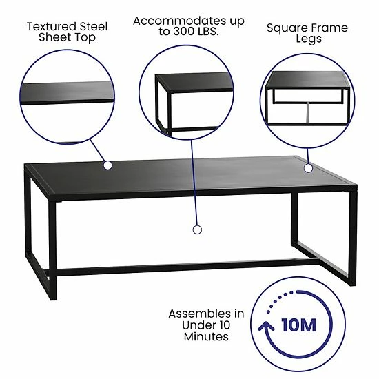Expand your living space to the outdoors with the updated style of this outdoor patio coffee table. Whether you are entertaining the neighbors, throwing a Saturday evening party, or just gathering with the family the on-trend design of this textured top black metal coffee table is a must-have. Providing not only valuable real estate for holding drinks, dinner plates, or beautiful flower arrangements, an outdoor metal coffee table will also anchor your outdoor decor and furnishings. Long-lasting durability is essential when choosing outdoor furniture that will be exposed to the elements. Made from 18 gauge steel, this rectangular metal table can be used year round. Welded construction with bolt reinforced joints allows this metal patio coffee table to hold up to 300 lbs. static weight capacity. For longevity, care should be taken to limit exposure to extended periods of moisture. Use this multipurpose table to give your sunroom, living room, or family room a style update or on your deck or patio to hold your potted outdoor plants. Fixed plastic floor glides will prevent damage to hard flooring surfaces when used inside and the assembly takes less than 10 minutes with the included tools and step-by-step instructions. Wipe your indoor/outdoor table with a damp cloth to keep it looking showroom new.