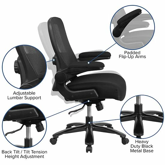 Get the extra support you need throughout your workday with our big and tall desk chair made to accommodate larger and taller body types. With a wider seat and back, this swivel chair with wheels makes it easier for long limbs to sit comfortably without restricting mobility or efficiency. Our desk chair with lumbar support helps keep your back properly aligned, preventing long-term strain. Its contoured seat relieves pressure points for enhanced comfort. Made from black nylon and ventilated mesh, our desk chair with back support features: – 360-degree swivel rotation capabilities for effortless maneuverability. – Built-in lumbar support that conforms to the natural curve in your spine. – A heavy-duty, five-star metal base that provides extra support and stability. – A tilt tension adjustment knob that lets you recline while controlling the chair’s tilt resistance level. This black mesh office chair features a pneumatic adjustment lever that allows you to set the chair at your desired height. Contoured back and padded seat reduce back strain, giving you the support you need to work efficiently, while the office desk chair’s flip-up armrests relieve wrist and shoulder fatigue. For next-level comfort, the chair’s waterfall front seat is filled with five inches of thick, padded foam to provide firm support while promoting circulation. This desk chair’s heavy-duty metal base and dual-wheel casters are rated with a weight limit of 500 pounds, while its executive-style exudes professionalism for the best of style and function. Enhance your work experience by sitting in this ergonomic chair with lumbar support that’s designed to promote concentration and reduce fatigue.