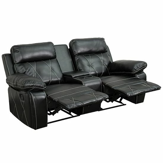 Spend some quality time with your family and friends for memorable movie nights, epic game days and legendary video game marathons, relaxing on this black home theater seating unit boasting soft and durable LeatherSoft upholstery. The ultimate in contemporary home theater seating, it features 2 recliners with recessed levers while the plush back has generous amounts of foam padding. This recliner unit has cup holders for your favorite beverages, and a storage console for remote controls, magazines and game controllers. Plastic floor glides protect your floor by sliding smoothly when you need to move it. When you have home theater seating, you can make every game day an event that rivals the Big Game; treat your friends to a cinematic experience; and challenge your friends and family to a virtual duel! You can setup as many rows as needed to fill up your desired space.