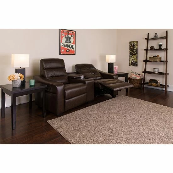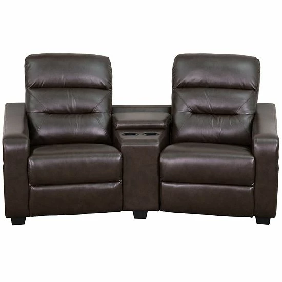 Spend some quality time with your family and friends for memorable movie nights, epic game days and legendary video game marathons, relaxing on this brown home theater seating unit boasting soft and durable LeatherSoft upholstery. The ultimate in contemporary home theater seating, it features 2 recliners with recessed levers while the plush back has generous amounts of foam padding. This recliner unit has cup holders for your favorite beverages, and a storage console for remote controls, magazines and game controllers. Plastic floor glides protect your floor by sliding smoothly when you need to move it. When you have home theater seating, you can make every game day an event that rivals the Big Game; treat your friends to a cinematic experience; and challenge your friends and family to a virtual duel! You can setup as many rows as needed to fill up your desired space.