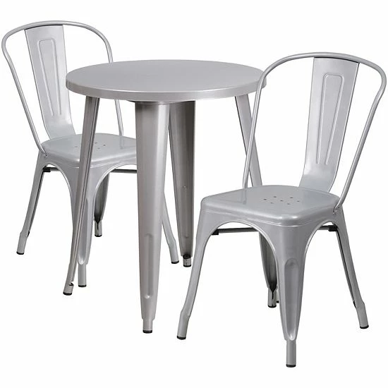 Complete your dining room, restaurant or patio with this chic table and chair set. This colorful set will add a retro-modern look to your home or eatery. Table features a smooth top and protective rubber floor glides. The stackable bistro chair features plastic caps that prevent the finish from scratching while being stacked. This 3 piece table set is designed for indoor and outdoor settings. For longevity, care should be taken to protect from long periods of wet weather. The possibilities are endless with the multitude of environments in which you can use this table, for both commercial and residential spaces.