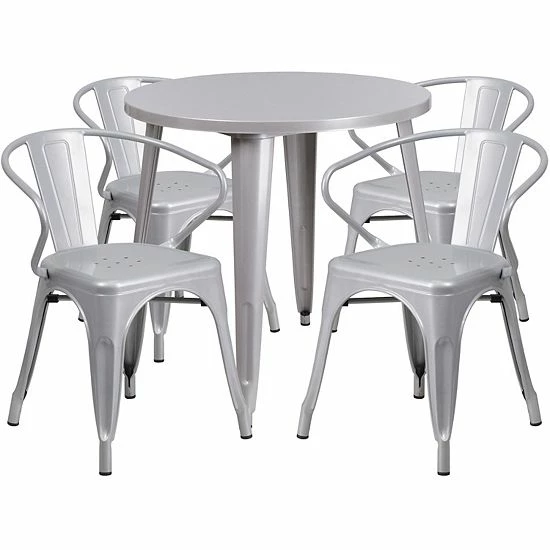 Complete your dining room, restaurant or patio with this chic table and chair set. This colorful set will add a retro-modern look to your home or eatery. Table features a smooth top and protective rubber floor glides. The stackable bistro chair features plastic caps that prevent the finish from scratching while being stacked. This 5 piece table set is designed for indoor and outdoor settings. For longevity, care should be taken to protect from long periods of wet weather. The possibilities are endless with the multitude of environments in which you can use this table, for both commercial and residential spaces.