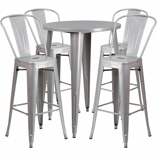 Complete your dining room, restaurant or patio with this chic bar table and chair set. This colorful set will add a retro-modern look to your home or eatery. Table features a smooth top and protective rubber floor glides. The stylish bistro style barstools features a curved, vertical slat back. This 5 piece table set is designed for indoor and outdoor settings. For longevity, care should be taken to protect from long periods of wet weather. The possibilities are endless with the multitude of environments in which you can use this table, for both commercial and residential spaces.