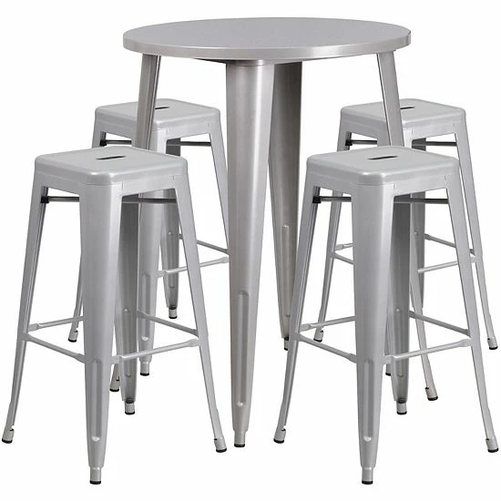 Complete your dining room, restaurant or patio with this chic bar table and chair set. This colorful set will add a retro-modern look to your home or eatery. Table features a smooth top and protective rubber floor glides. The stackable barstools feature plastic caps that prevent the finish from scratching while being stacked. This 5 piece table set is designed for indoor and outdoor settings. For longevity, care should be taken to protect from long periods of wet weather. The possibilities are endless with the multitude of environments in which you can use this table, for both commercial and residential spaces.