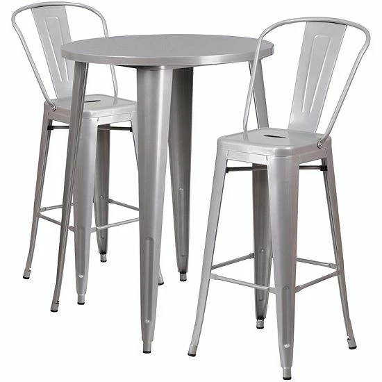 Complete your dining room, restaurant or patio with this chic bar table and chair set. This colorful set will add a retro-modern look to your home or eatery. Table features a smooth top and protective rubber floor glides. The stylish bistro style barstools features a curved, vertical slat back. This 3 piece table set is designed for indoor and outdoor settings. For longevity, care should be taken to protect from long periods of wet weather. The possibilities are endless with the multitude of environments in which you can use this table, for both commercial and residential spaces.