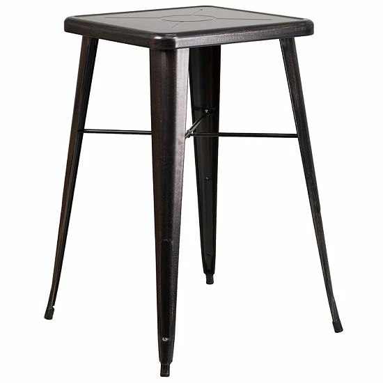 With its simple lines and bright color, this indoor-outdoor metal bar height table is sized right for small spaces. Compact in design, the table top is 23.75 inches square and has a 2 inch lip with rounded corners. The legs extend to 27.75 inches in width at the base. The table features a cross-brace that provides increased support and stability. Rubber floor glides protect your floor by sliding smoothly when you need to move the table. Galvanized steel construction and a powder coat finish ensure durability and easy maintenance. Designed for both commercial and residential use, this trend-setting table is a great choice for your home or the bar area in your restaurant.