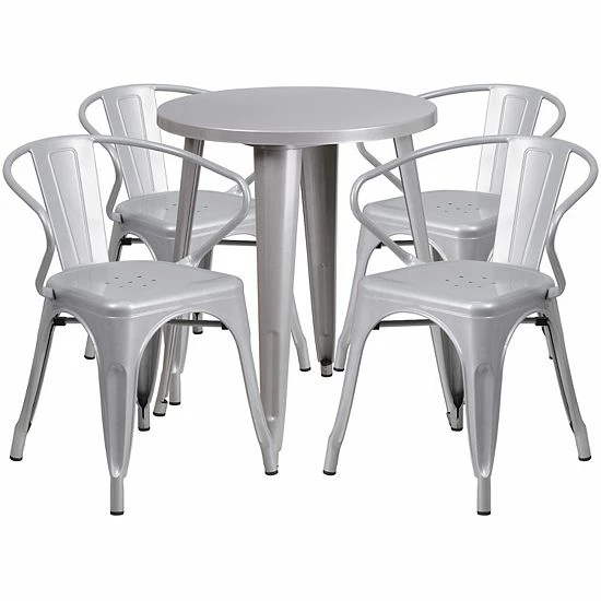 Complete your dining room, restaurant or patio with this chic table and chair set. This colorful set will add a retro-modern look to your home or eatery. Table features a smooth top and protective rubber floor glides. The stackable bistro chair features plastic caps that prevent the finish from scratching while being stacked. This 5 piece table set is designed for indoor and outdoor settings. For longevity, care should be taken to protect from long periods of wet weather. The possibilities are endless with the multitude of environments in which you can use this table, for both commercial and residential spaces.
