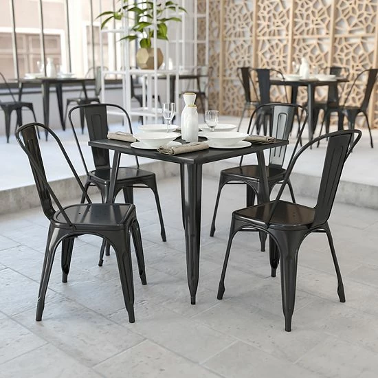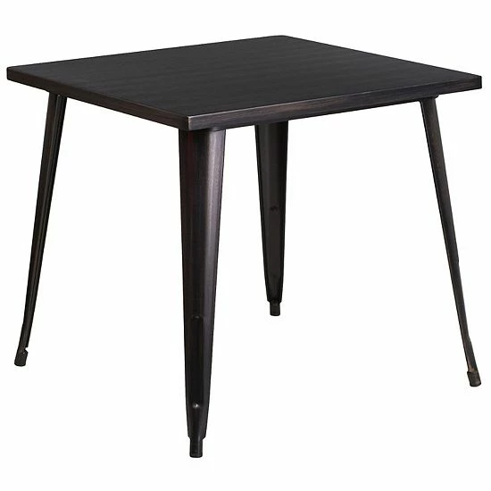 Create a vibrant, energetic dining space with this colorful industrial style black metal table. This lively table will add a retro-modern look to your home or business. Pair this table with like colored metal chairs for a uniform look or mix things up by adding different colored chairs. A thick brace underneath the top adds extra stability. The legs have protective rubber floor glides that prevent damage to flooring. This all-weather table is great for indoor and outdoor settings. For longevity, care should be taken to protect from long periods of wet weather. Great for both commercial and residential spaces, the decorating possibilities for this table are only limited by your imagination!