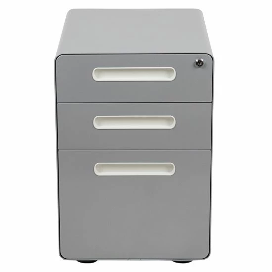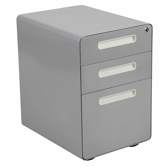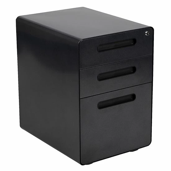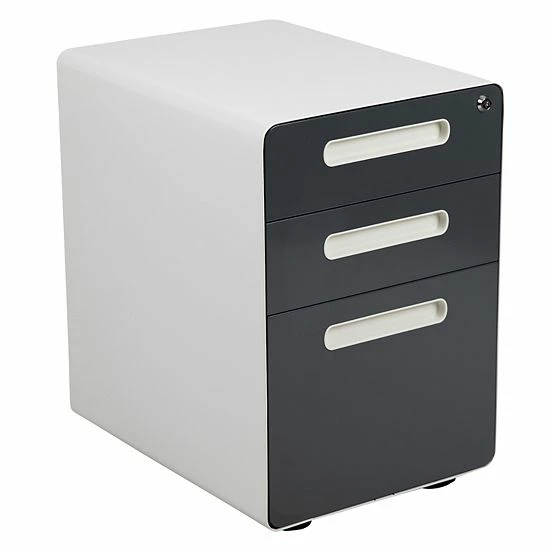 You may love your current desk but have nowhere to store your paperwork without cluttering the desktop, insert this locking file cabinet to keep the minimalistic appearance of your modern office desk. This 3-drawer pedestal file cabinet has low set casters to keep up with the needs of a busy worker. The convenience of casters is ideal for employees who regularly file documents, allowing them the option to pull the cabinet near them while monitoring incoming emails. The modern 3-drawer mobile file cabinet has two utility drawers to hold your small office supplies, snacks, vitamins and writing utensils while the hanging file drawer holds A4, letter, legal, and F4 hanging folders. Folder longer documents such as your legal size paperwork vertically using the conversion bar. An included pencil tray keeps your small supplies neatly stored and can be used in either of the two utility drawers. Two keys are included to keep in separate locations or as a duplicate for your assistant. Inset drawer handles provide a modern appearance and a worry-free solution to loosening handle screws. Organize your office space with this mobile under desk filing cabinet that comes fully assembled and ready-to-use. This ergonomic filing cabinet is a smart solution for any workplace whether used for heavy-duty daily filing or the casual user.