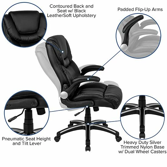 Having the right chair to support you through your work day is priceless. This high back executive office chair with a double layered headrest provides a savvy appearance with LeatherSoft upholstery on the seat and back cushions. LeatherSoft is leather and polyurethane for softness and durability. High back office chairs extend to the upper back for greater support of the neck, shoulders and back. The high back design relieves tension in the lower back, preventing long term strain. Built-in lumbar support paired with the contoured back and seat will cradle you in comfort. The tilt lock mechanism rocks/tilts the chair and locks in an upright position while the tilt tension adjustment knob adjusts the chair’s backward tilt resistance. Chair easily swivels 360 degrees to get the maximum use of your workspace without strain. The pneumatic adjustment lever will allow you to easily adjust the seat to your desired height. Give yourself the gift of comfort that will help you stay focused to power through your working hours.