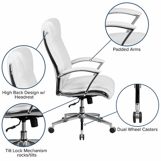 An elegant blend of comfort and style, this high-back LeatherSoft office chair is the perfect seating solution for your workspace. Crafted from white LeatherSoft material with chrome arms and a chrome base, the ergonomic design brings a sleek look with ample durability and support for long-term use. Designed for exceptional comfort, this LeatherSoft office chair features a cushioned seat and back, with headrest, upholstered in white LeatherSoft for softness and durability. Padding on the arms lends additional comfort, while horizontal stitching along the seat and back adds a touch of refinement. The high-back office chair features extended height to support your upper back and help relieve back tension. A waterfall front seat edge removes pressure on your lower legs, to help improve circulation during long hours at your desk. Complete your custom fit with the pneumatic seat height adjustment lever and a tilt-lock mechanism for a rocking and reclining motion. Easily maneuver through a variety of tasks with the full 360-degree swivel chair motion that is ideal for shifting between your computer, phone, and more. When you need to reach things a little further away, simply roll your chair with the smooth movement of the wheeled base. A bright chrome finish adorns the frame and arms of this office desk chair, creating a sleek and timeless look. The classic white LeatherSoft pairs effortlessly with any office decor style, creating a comfortable and elegant impression that’s perfect for residential or corporate workspaces.