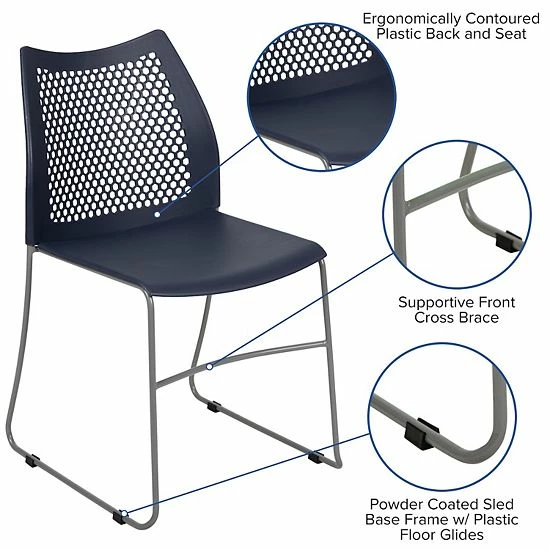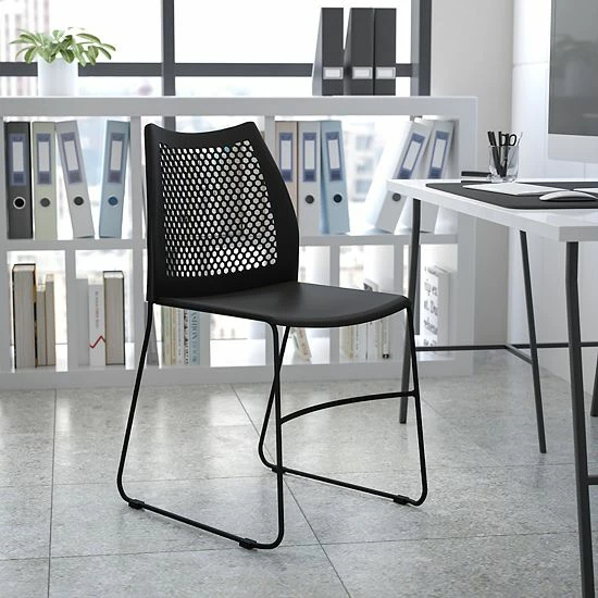 Grab the attention of visitors when they step into your meeting space and see these smart looking guest chairs. This modern beauty features a fully perforated back to provide airflow during conference hall meetings. Designed for versatility this chair is designed for reception areas, school functions, break rooms, cafeterias, event spaces and express emission testing locations where customers must get out their vehicle. Always be ready for guests by having several plastic guest chairs tucked away in your home. If you work in grungy environments and need a chair that is easy to clean plastic stack chairs are ideal. Store or transport up to 5 chairs on our compatible steel sled base stack chair dolly. When in need of a space-saving seating solution that is permanent or temporary, allow this stackable side chair to work for you.