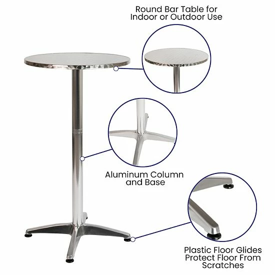 Give guests a place to chat or some much needed real estate to hold glasses or hors d’oeuver plates with this aluminum bar height table. The shiny aluminum finish paired with a smooth designer looking top makes a great addition to any event venue, home or patio. Create a formal setting by covering this table in a long tablecloth or use as is outdoors on the deck. No matter what the occasion, having extra table space is always a plus. The lightweight aluminum base allows you to transport this bar height dining table with ease indoors and outdoors for your events. Adjustable floor glides ensure a stable dining surface and prevent damage to hard flooring surfaces while using indoors. With seating for two, you can pair with two aluminum bar chairs or have guests stand around the table with a drink while they wait to be seated. When using outdoors, care should be taken to protect from long periods of wet weather.