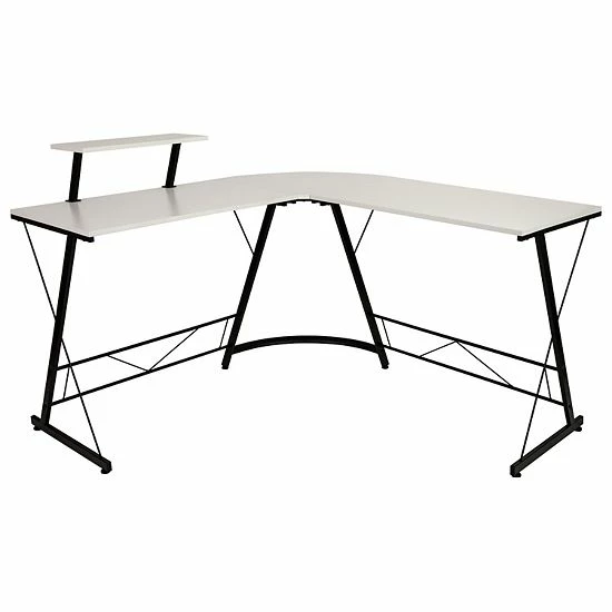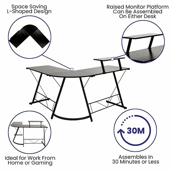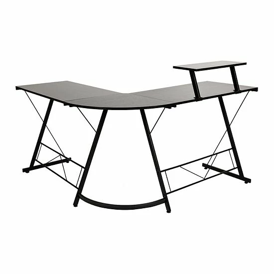 - L-Shaped desktop provides large surface for computer accessories or gaming consoles
