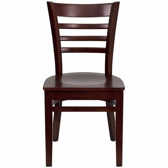 Create a first-rate dining experience by offering your patrons great food, service and attractive furnishings. This classic mahogany wood chair will offer guests a warm, inviting look when entering your establishment. This chair will make an attractive addition to your restaurant, lounge, bar or other high traffic venue. This chair is easy to clean, which is an important aspect when it comes to a business. This chair was designed to withstand the daily rigors in the hospitality industry, but will also provide a cozy, intimate quality to your home. The ladder back design and mahogany wood finished seat will keep your guests comfortable. The durable frame is stabilized with mortise and tenon construction with metal wood screw reinforcements and a curved support bar for extra stability. The floor glides help protect your floors and ensure smooth gliding. This charmingly styled chair is a must have, whether used in the home or your commercial business.
