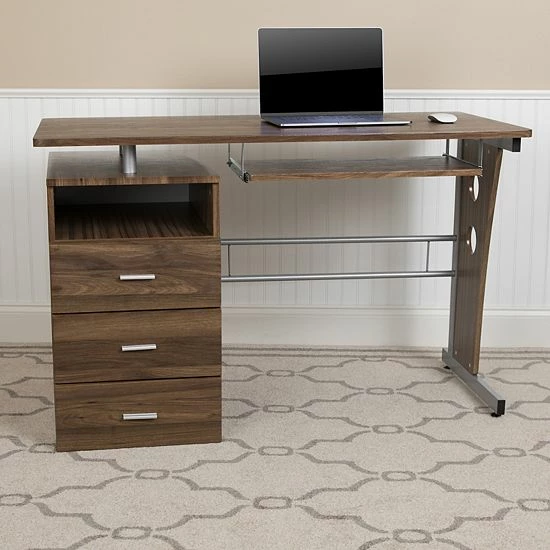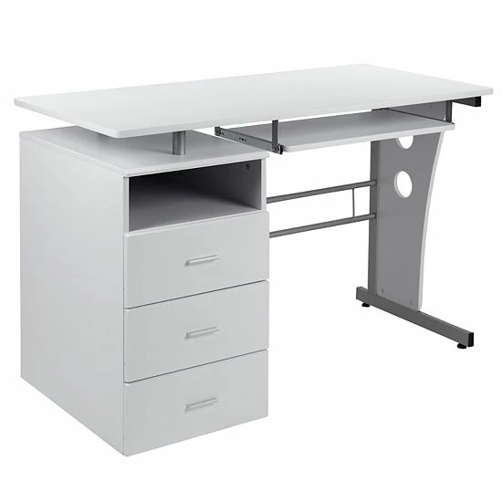 Accomplish it all on this executive pedestal computer desk. Talk about storage, this computer desk packs in a lot while maintaining a small footprint. You’ll have plenty of space on this storage desk for your laptop, desktop monitor and other office necessities that you can keep within reach. Four storage compartments, one open, three enclosed behind drawers will keep your workspace tidy. The keyboard tray can double as a place to store your writing materials and small devices while you’re working on your laptop. Upgrade to a new single pedestal desk that is full of function to power through your workday.