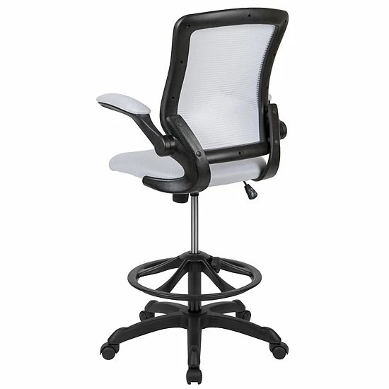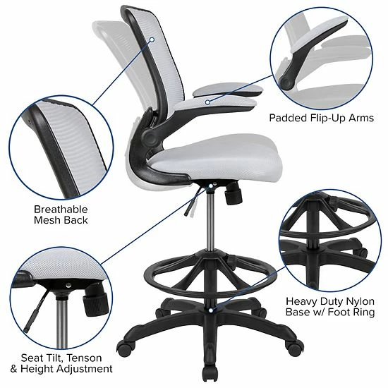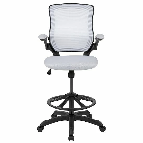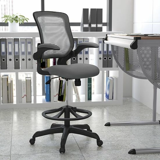 Be proactive at work when you roll this high office chair into the office to accompany your high desk. The high desk chair pairs well with sit-to-stand desks, standing desks, bar height tables and drafting tables. This ergonomic mesh back drafting chair allow employees working with the public to be at a comfortable eye-level when their work surface is above standard desk height. Enjoy the comforts of an ergonomic chair in a taller frame to meet the needs of students and professionals working at above average desk heights. The curved back cradles you while offering built-in lumbar support. Designed with your comfort in mind, this drafting stool features a pressure relieving waterfall edge seat and flip-up arms to relieve pressure off your shoulders and neck. Pull the tilt lock out to recline and rock or push in to lock in an upright position. The frame is outfitted with a stylish height adjustable foot ring. Draft chairs are essential for any profession where work surfaces are above standard height, such as lab technicians, receptionists, architects, graphic artists, or any other creative assignment. With the ventilated mesh material, you’ll be kept at a cool temperature throughout the day on this draft chair to complete your tasks.