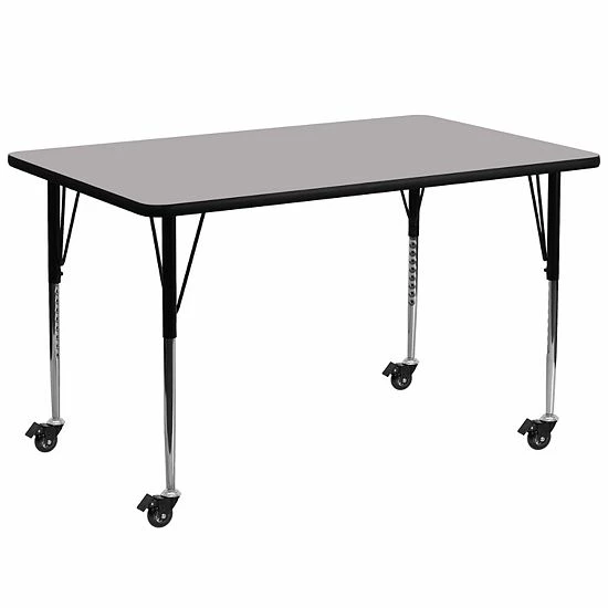 The Rectangular Activity Table is a versatile option for school classrooms, corporate training centers and your home. Enhance collaborative learning by grouping tables together. It will accommodate children of all ages, from 1st grade to adult. It features a 30W x 72L thermal fused scratch, stain and warp resistant laminate top with a black edge band and 16 gauge tubular steel legs for increased stability. The top incorporates a protective underside backing sheet to prevent moisture absorption and warping. An attractive black powder coated finish protects the upper legs from scratches and height adjustable chrome lower legs give you the flexibility to raise or lower the table a full 9 in 1 increments. Casters allow you to easily move the table around and then lock into place. This activity table provides a durable work surface for anything from computer labs to project meetings to laying out fabric in your sewing room.