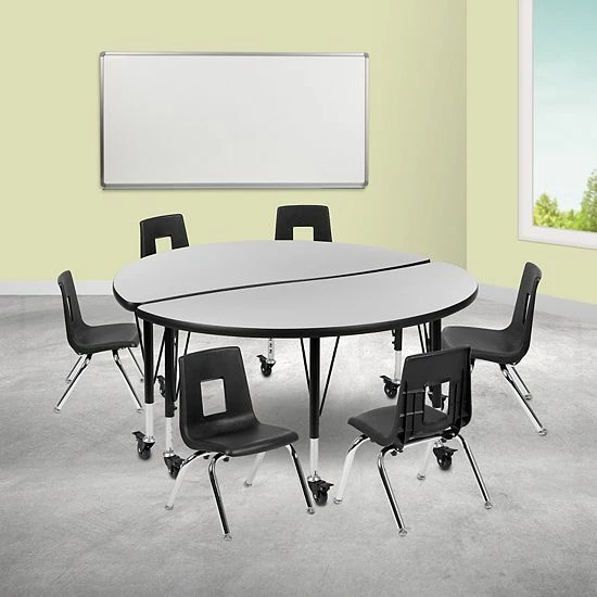 Rearrange your classroom without breaking a sweat with this collaborative mobile table set. Group settings encourage students to interact to work towards a common goal. You can create unlimited combinations using various shapes and colors. With our ergonomic shell student chairs included there is no need to shop around. Practical for any class setting this school table group will last you for many years with its durable thermal fused laminate top that is scratch, stain and warp resistant. Height adjustable chrome lower legs give you the flexibility to raise or lower the table. Locking casters allow you to lock each caster as needed to move or lock in place. Purchase our pre-built table and chair bundle for your classroom, daycare, Sunday school or home. The plastic stack chairs with 12 seat height are ideal for preschool and kindergartners.