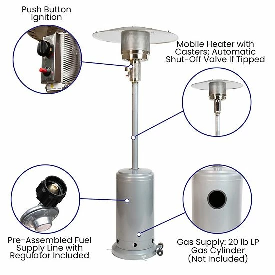 Extend the amount of time you can use your outdoor leisure and dining areas at your home or business when you purchase one or more of this 40,000 BTU outdoor patio heater. The improved appearance of today’s outside heaters will complement your outdoor furnishings and will lend a wow factor to open-air commercial events. This silver propane patio heater has a 9-16 foot heat radius that quickly chases away the chill from dropping temperatures. The attached wheels allow the heater to be easily moved from place to place as needed and 3 included anchors can be affixed to your patio or decking (wood or concrete screws not included) to keep the unit stable and secure once in place. Made from premium stainless steel, and boasting metal screw construction, this outdoor heater is built to last and will be a welcomed addition to your outdoor living areas. A 20 lb. LP propane cylinder fits snugly in the tank housing and will provide hours of warmth for your guests. Gather a phillips screwdriver and the included open ended wrench and have your new radiant heating appliance put together in under 90 minutes. Pair this traditional outdoor heater with our set of 4 all-weather poly resin wood adirondack chairs for a complete setup.