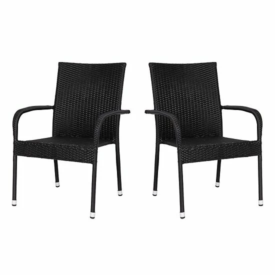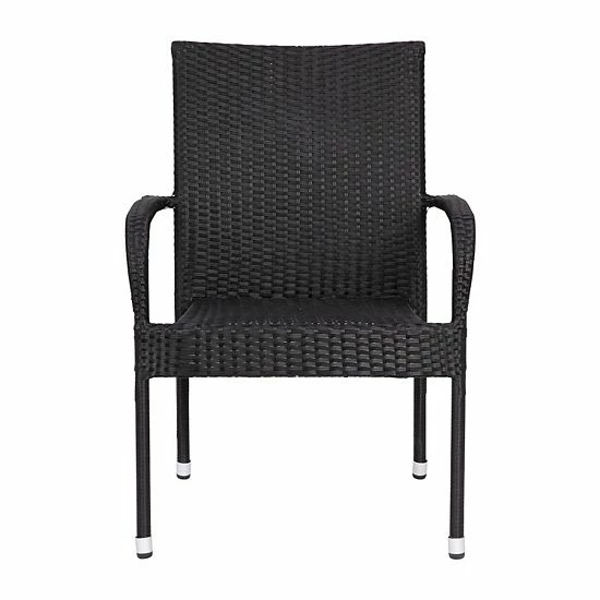 Create a custom outdoor seating or dining area with this set of four woven wicker patio chairs in black. The modern polyethylene wicker is durable and weather resistant for lasting use and the sturdy powder coated steel frame is resistant to rust and corrosion making it perfect for outdoor use. A curved back and integrated armrests encourage lounging and offer unsurpassed comfort for all of your guests. Looking for a unique touch inside? Use these chairs as dining or accent chairs and make any home feel like a beach vacation. Shipped preassembled and ready to use for your convenience, backyard parties are quickly within reach. These chairs stack up to four high for easy storage when not in use. Pair with one of our wicker and acacia wood tables for a complete look. For easy cleaning, simply wipe down with a damp cloth.