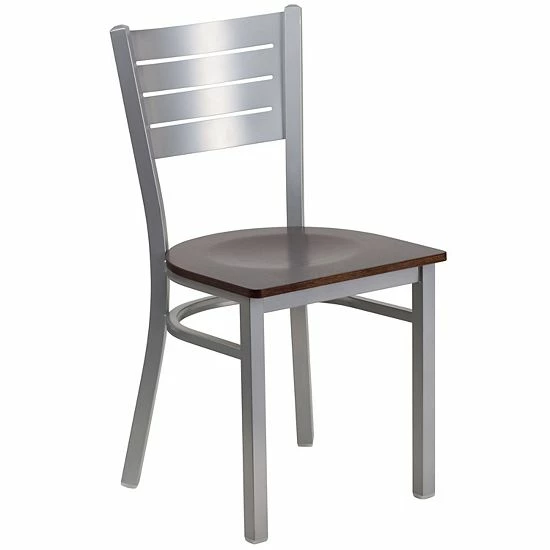 The silver slat back metal restaurant chair will be an attractive addition to your cafe, coffee house or dining room. This metal chair has a slat back design, cherry wood seat and an 18 gauge steel frame with a silver powder coated finish. The welded joint assembly and curved support bar gives the chair great strength and stability. Plastic floor glides protect your floors by sliding smoothly when you need to move the chair. The slat back metal restaurant chair is a durable commercial grade restaurant chair that would also be great for use in your home.