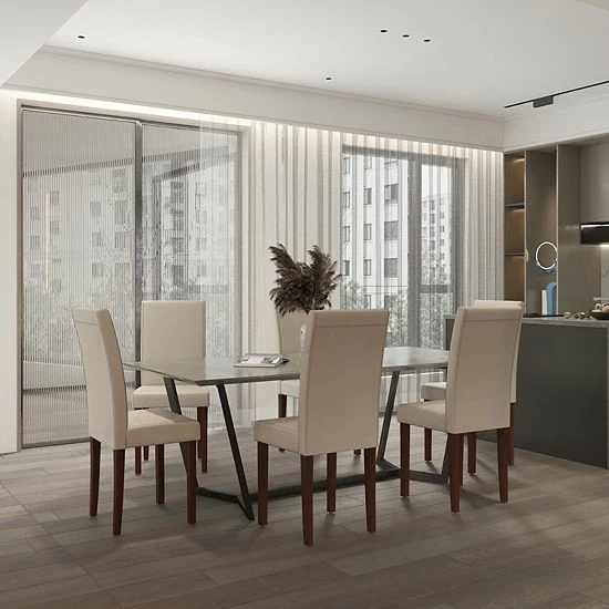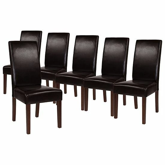 Whether you’re moving into a new home or refreshing your current living space, having a place to relax together for a meal with family and friends or a comfortable place to unwind and indulge in some self care after a long day is a must. This set of six beige faux leather upholstered parsons chairs with generous padding is the versatile seating option you need. Featuring a timeless, panel back design and a solid hardwood frame in mahogany, this chair will be a beautiful addition to your home. The minimalist, armless design serves perfectly as a dining chair or accent seating in the bedroom, living room or foyer and maintains an open feel. With a 300 lb. weight capacity, all of your guests can enjoy a worry free seating experience. Assembly takes less than 30 minutes and the chair cleans easily with vacuuming or light brushing.