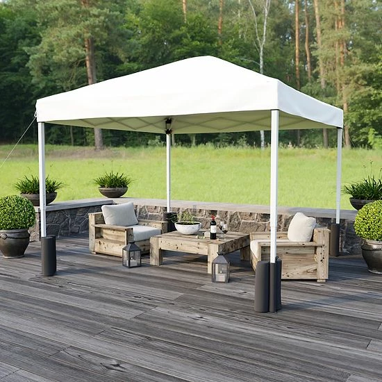 Relish your outdoor activities when you use this blue 10′ x 10′ pop up canopy tent that will help keep you cool so you can enjoy your time with family and friends. The weather resistant polyester top has reinforced corners to prevent ripping or tearing and is UV coated to resist fading from the sun’s rays. Simply unfold the fabric top, attach to the upper frame with the hook and loop fasteners, extend the bottom legs and pull open for instant protection. Strength and durability abound in this instant canopy. The white powder coated steel frame is rust and corrosion resistant and locks in place with a pinch free locking mechanism. The height adjustable frame takes you from the backyard to the beach and everywhere in between. Secure the included weight bags to the bottom legs then fill with sand (not included) to ensure maximum stability. This canopy pop up tent folds up when not in use and has its own wheeled case for easy transport and storage. This quick shade canopy includes the frame, canopy top, stabilizing ground stakes, weight bags and a wheeled storage case. Assembly takes less than 10 minutes and does not require tools. Take this portable shade canopy on camping trips, tailgating, the kids soccer games or for get togethers on your patio or in the yard. This party canopy tent will look great season after season.