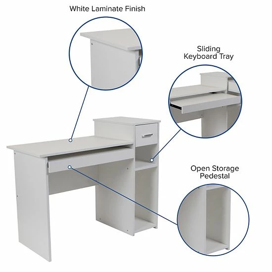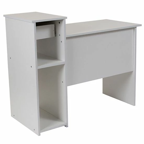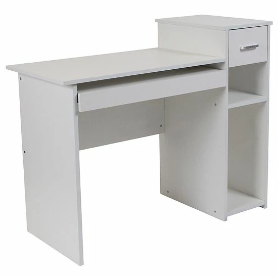You may have to work but you can do it in style with this beautiful white desk. This workstation can be used as a stand-alone desk, or combined with other similar desks to create a spacious, comfortable work environment. Featuring a contemporary design, the white laminate finish has subtle lines with a modern look. The straight lines and open sides make this desk right at home in any home office. Thanks to the spacious multi-tiered surface, this desk provides a lot of workspace. Additionally, this desk features a sliding keyboard tray, open storage pedestal, and box drawers for storing pens, papers, binders, or other office supplies.