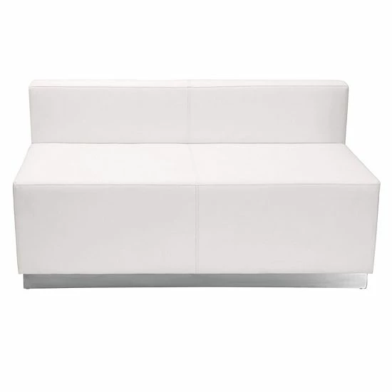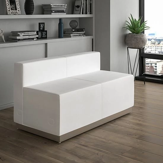 Moving your furniture around is a quick and easy way to change up the look and feel of your space so modular pieces like this white LeatherSoft upholstered loveseat are a must have. LeatherSoft is leather and polyurethane for added softness and durability. This modern loveseat gives an upscale, sophisticated look to any space and can be used in conjunction with other pieces or as a standalone. The armless design gives the illusion of space and creates an airy feel even in a small room. Supported by a brushed stainless steel base, this loveseat is durable and will withstand years of use. Adjustable floor glides ensure a level seating surface while the locking bolt connects this piece to chairs in this collection. As your business grows, you can add on more pieces and reconfigure your design. This innovative contemporary chair will bring comfort and trend-setting style to your waiting room, reception area or lounge.