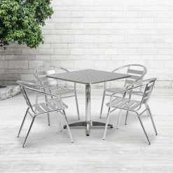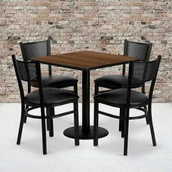 Emma+Oliver Emma And Oliver 30″ Square Walnut Laminate Table Set, 4 Grid Back Metal Chairs